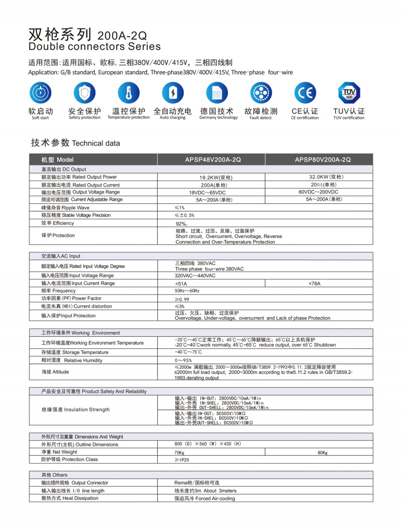 觸摸屏智能操作設(shè)計:告別傳統(tǒng)按鍵方式,給您帶來更現(xiàn)代更具科技智能的操作體驗 自動充電:插槍自動充電,簡化充電流程,便于操作 兼容性高:80V200A兼容48V200A充電 多重保護: 輸出短路,過流過壓保護,反接保護,電流導(dǎo)管保護等多重保護 預(yù)約充電功能:避開高峰用電時段,有效節(jié)省成本 雙語切換:中英文雙語隨需切換,跨越語言障礙,與世界接軌 人性化設(shè)計:充電機背板內(nèi)部附部件明細及產(chǎn)品接線圖,方便客戶可更清楚的了解產(chǎn)品,便于維修,提高售后時效 獨特設(shè)計: 內(nèi)置電磁鎖驅(qū)動模塊,防止臨時斷電鎖槍 使用壽命更長:功率模塊預(yù)留20%空間,提高模塊的使用壽命 出色內(nèi)部結(jié)構(gòu): 內(nèi)部結(jié)構(gòu)左右出風(fēng),內(nèi)部電路不容易積粉塵,提高充電機壽命