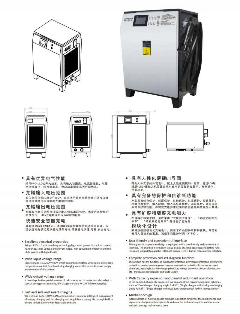 觸摸屏智能操作設計:告別傳統按鍵方式,給您帶來更現代更具科技智能的操作體驗 自動充電:插槍自動充電,簡化充電流程,便于操作 兼容性高:80V200A兼容48V200A充電 多重保護: 輸出短路,過流過壓保護,反接保護,電流導管保護等多重保護 預約充電功能:避開高峰用電時段,有效節省成本 雙語切換:中英文雙語隨需切換,跨越語言障礙,與世界接軌 人性化設計:充電機背板內部附部件明細及產品接線圖,方便客戶可更清楚的了解產品,便于維修,提高售后時效 獨特設計: 內置電磁鎖驅動模塊,防止臨時斷電鎖槍 使用壽命更長:功率模塊預留20%空間,提高模塊的使用壽命 出色內部結構: 內部結構左右出風,內部電路不容易積粉塵,提高充電機壽命