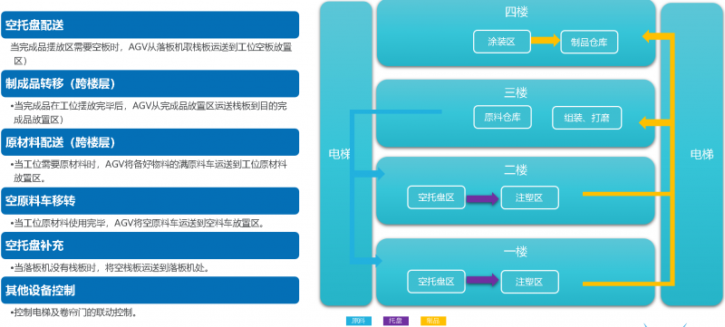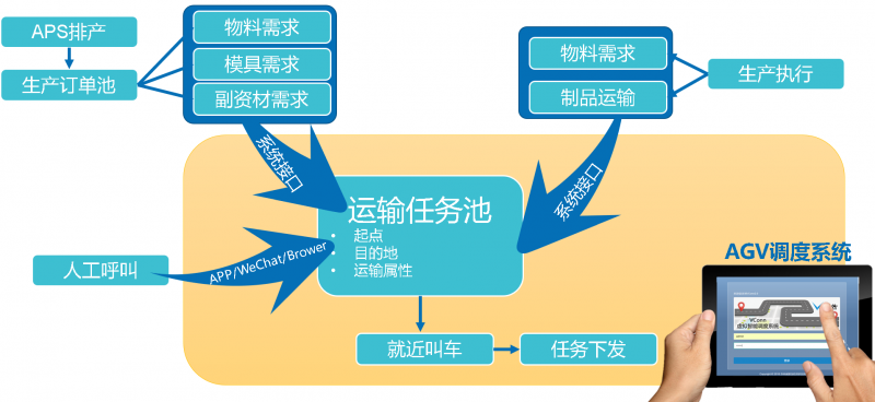 用AGV調(diào)度系統(tǒng)(VConn)完成物料計劃下發(fā),現(xiàn)場叫料之間的系統(tǒng)閉環(huán),考慮到異常送料需求,系統(tǒng)保留人工呼叫接口,可以快速與第三方系統(tǒng)或設(shè)備對接