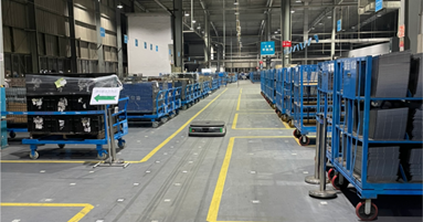 KUKA AMR系統針對客戶現場情況,專門設立與高沖自動物流線Robot arm的對接區域,打通了高沖自動物流與倉庫存儲之間的自動化連接流程,實現物料自動入庫,不僅提高運輸準確率,同時減少用工成本;