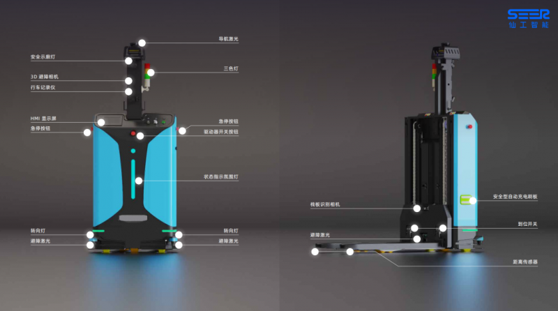 仙工智能 SRC 系列核心控制器打造的激光 SLAM 智能叉車整車實現(xiàn)多種傳感器的超高配置,360° 立體安全防護,提升了 AMR 運行過程中的安全等級,包括:導(dǎo)航激光、前后避障激光、安全觸邊、距離傳感器、急停按鈕、3D 避障相機等。