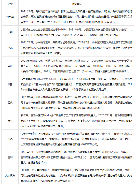 事實上,除了一眾新能源車企“入局”機器人外,傳統汽車廠商們也在通過投資、入股、自主研發等方式布局機器人。