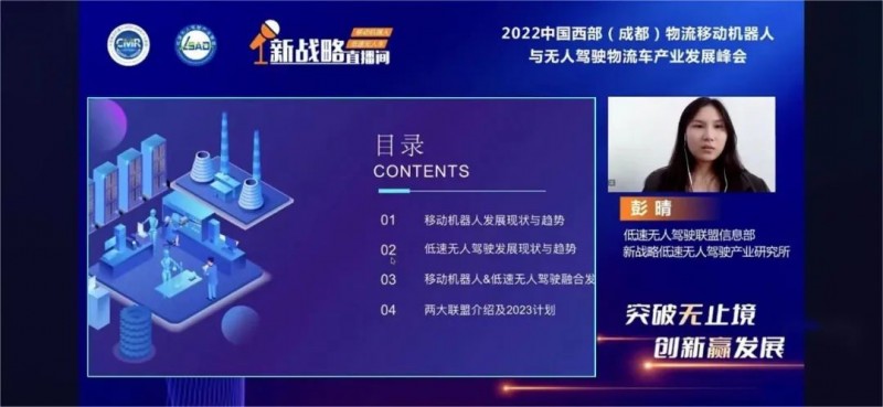 11月23日,由中國移動機器人(AGV/AMR)產(chǎn)業(yè)聯(lián)盟、低速無人駕駛產(chǎn)業(yè)聯(lián)盟、《物流搬運機器人》雜志社、《低速無人車》雜志社、成都北辰中金展覽有限公司聯(lián)合主辦,新戰(zhàn)略移動機器人全媒體、 新戰(zhàn)略低速無人駕駛全媒體協(xié)辦的2022中國西部(成都)物流移動機器人與無人駕駛物流車發(fā)展峰會在線上成功舉行!