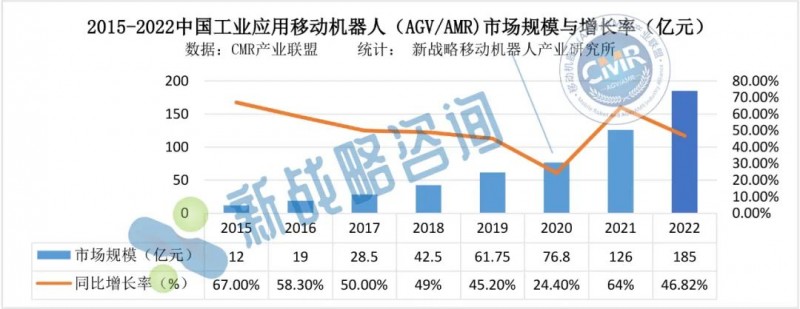 根據CMR產業聯盟數據,新戰略移動機器人產業研究所統計,2022年度,中國工業應用移動機器人(AGV/AMR)銷售數量93000臺(含銷往海外市場),較2021年增長29.17%,市場規模達到185億元,同比增長46.82%。