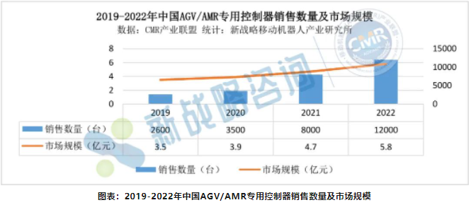 根據CMR產業聯盟數據,新戰略移動機器人產業研究所統計,2022年AGV/AMR專用控制銷售數量約為12000臺,同比增長50%,市場規模在5.8億左右,同比增長23.4%。