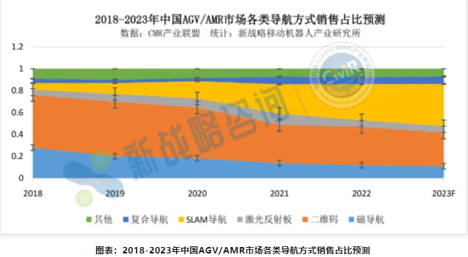 隨著工業應用移動機器人(AGV/AMR)智能化、柔性化與多樣化的發展趨勢,從導航方式來看,預測未來五年內,磁導航產品的市場新增量將會持續走低,市場占比不斷縮小,無論是展會現場展示還是企業的方案推薦,磁導航的應用空間較為有限,但一定時間內仍將存在于適用的行業;二維碼導航因其價格及適用領域的特殊性,未來很長時間內仍然占據較大比重,但占比逐漸縮小;增量最明顯的無疑屬于自然導航,激光SLAM和視覺SLAM,也就是AMR產品的快速躍升,未來將會是主流的導航方式,2022年度占比已達到32.98%,已經成為超越磁導成為第二大品類,預計2023年有望超越二維碼,成為應用最多的導航方式。