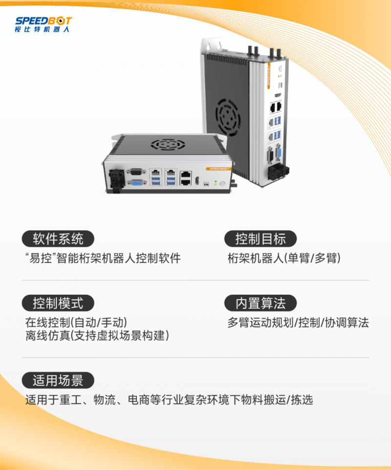 針對以上亟待解決的難點,視比特機器人推出了國內首款多臂智能桁架機器人控制器——SpeedTruss,以最優運動規劃突破傳統桁架自由度限制,實現了多臂共軸桁架機器人在復雜環境、復雜任務下的自動規劃、主動避障、敏捷執行,適應全場景柔性生產需求;同時支持低代碼靈活開發,極大地簡化了開發流程,大幅縮短了投產周期,為工廠智能化水平和生產效率的提升帶來質的飛躍。