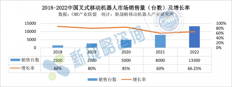 據CMR產業聯盟數據、新戰略移動機器人產業研究所統計,2022年中國叉式移動機器人銷量達13300臺,同比增長66.25%,市場規模約為34.68億元,同比增長41.55%。