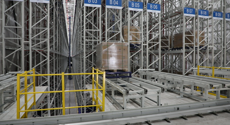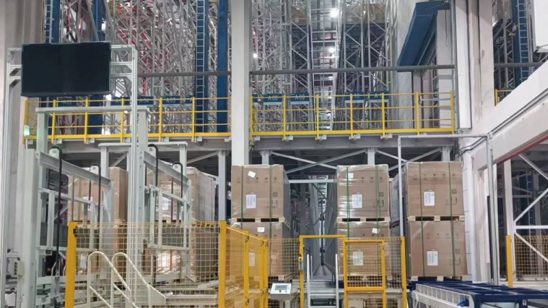 立庫占地1.8萬平米,配備14000多個(gè)托盤貨位,能夠存儲(chǔ)27000多箱貨品。在該項(xiàng)目中,曠視機(jī)器人通過智慧物流軟件平臺(tái)“曠視河圖”,集成15臺(tái)高20多米單元載荷3噸的雙立柱雙深位堆垛機(jī)、450余臺(tái)輸送機(jī),以及若干疊托機(jī)、打帶機(jī)、RGV等核心設(shè)備,實(shí)現(xiàn)從成品光伏組件下線后的自動(dòng)供給母托盤、合托、打帶入庫,以及成品發(fā)貨出庫,并兼容反向物流。