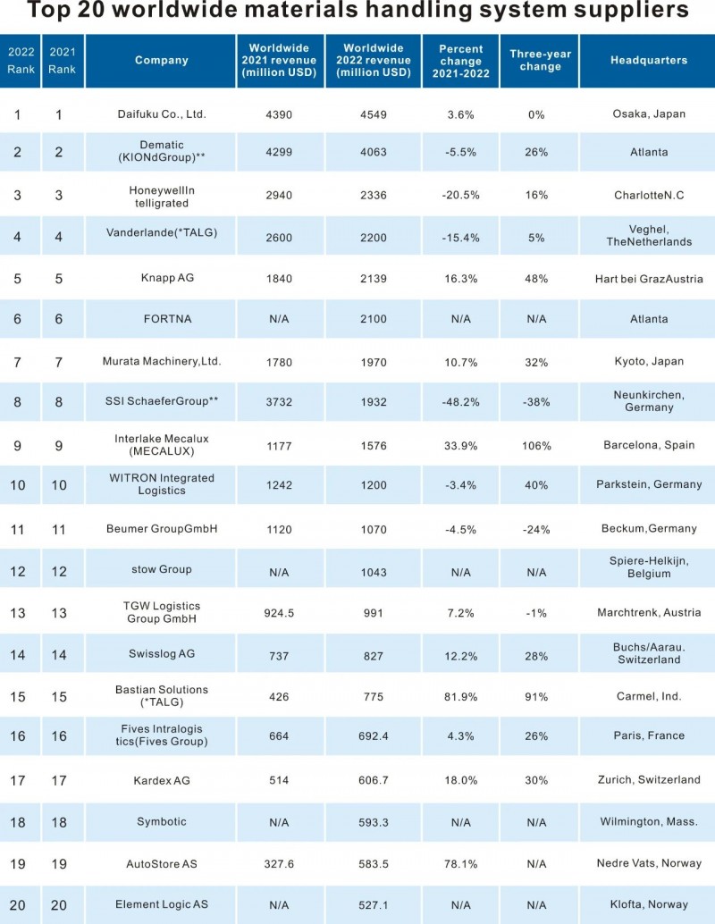 大福仍然以 45.4 億美元的年銷售額位居榜單第一,高于 2021年的  43.9 億美元收入。大福將其持續(xù)增長歸功于上一年的大量訂單積壓、對半導(dǎo)體制造商的強(qiáng)勁銷售、零售和電子商務(wù)部門系統(tǒng)的擴(kuò)展以及服務(wù)收入的提高。
