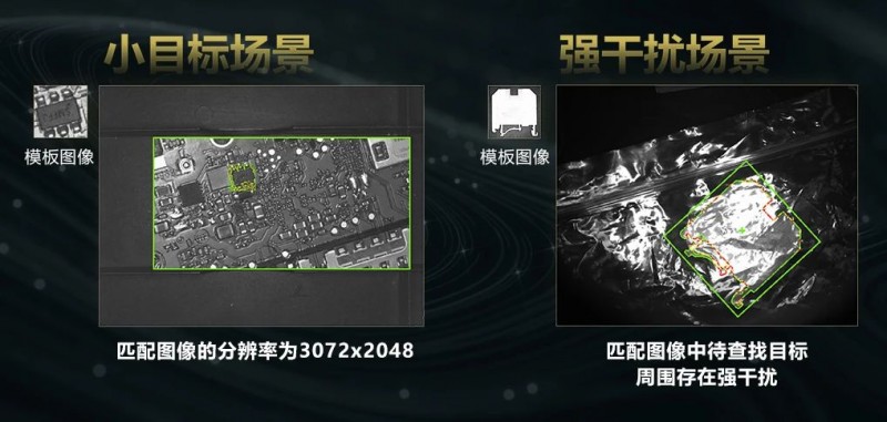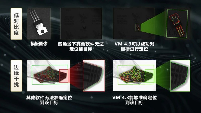除了算法效率提升,VM4.3還進一步優化了算法性能。以模板匹配算法為例,通過采用更魯棒的邊緣定位技術,在極低對比度及復雜邊緣干擾的情況下,VM4.3能夠精準定位到目標。