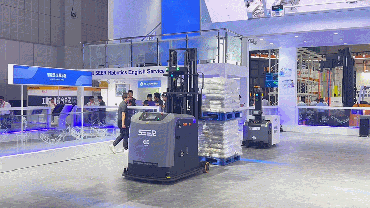 兩款今年新上市的智能叉車 SFL-CBD15 和 SFL-CDD16 在同一展區(qū)內(nèi)協(xié)同作業(yè),互為運行障礙物。兩車在保持最快 2m/s 的運行速度下依舊完美多次避讓,在避障激光、3D 避障相機、距離傳感器等多種傳感器的保護下實現(xiàn)高速暢行,順滑過彎,精準避障,靈活繞行。