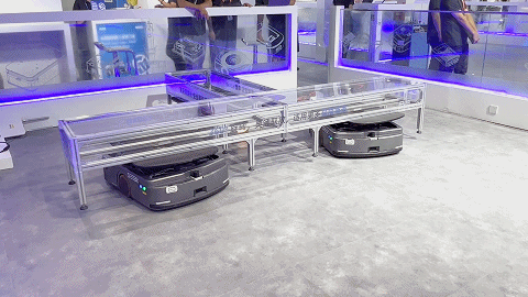 激光 SLAM 旋轉(zhuǎn)頂升搬運機器人 SJV-SW600 作為最具性價比的新款機器人,前后配備雙激光,定位精度可達 ±5mm,并支持頂升隨動功能。現(xiàn)場三臺 SJV-SW600 通過 Roboshop Pro 完成車體部署,基于 RDS 實現(xiàn)多車統(tǒng)一調(diào)度,對 T 字形托盤進行完美協(xié)作搬運,三機同時頂升轉(zhuǎn)圈,盡顯絲滑流暢。