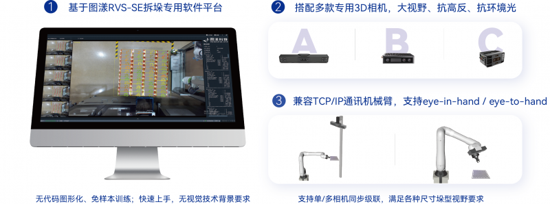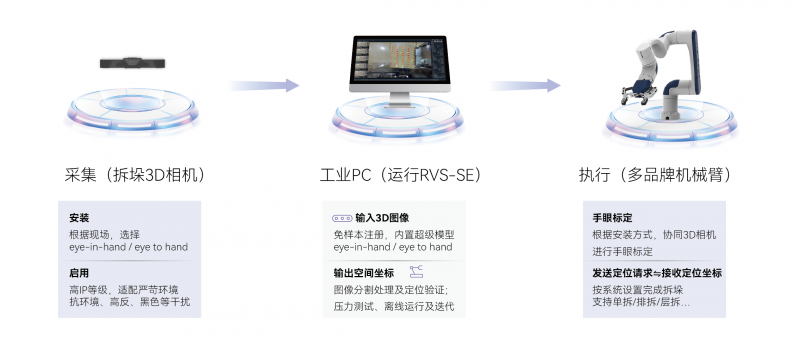 RVS-SE標(biāo)準(zhǔn)拆垛方案產(chǎn)品,由RVS-SE軟件和固定搭配的3D工業(yè)相機(jī)組成,用戶可以自選機(jī)械臂和前端執(zhí)行部件、工控機(jī)。