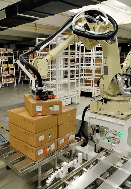 現(xiàn)場了解該客戶產(chǎn)線目前為四款箱型(后續(xù)有新增箱型SKU需求),部分箱型有膜覆蓋、膠帶反光等干擾情形,同時廠房布局緊湊,光照復(fù)雜,機(jī)器人拾取到放置運轉(zhuǎn)空間小,拆垛系統(tǒng)需具備路徑規(guī)劃與碰撞檢測能力;整體效率要滿足客戶需求,銜接連貫。