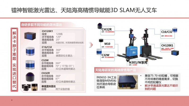 在論壇分享會上介紹了無人叉車配置的技術領先全球的鐳神智能激光雷達系列產品,解決了卡脖子難題,實現國產化自主可控,每臺無人叉車周身配置7-8顆激光雷達,提供豐富穩定的全方位立體感知信息,做到更安全、更穩定、更可靠。