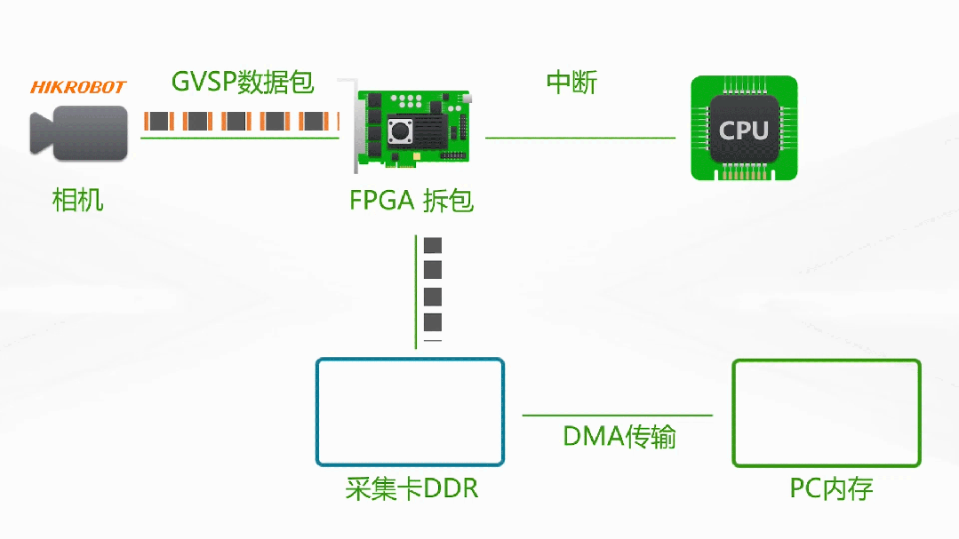 MV-GE1104卡端采用FPGA方案,在采集卡上即可對相機傳輸的GVSP數據包進行拆包組幀,直接通過DMA傳輸,直接將圖像數據拷貝至PC內存中,從根本上解決了網絡傳輸的丟包問題。這種傳輸模式幾乎對PC負載沒有消耗,可在CPU滿負荷工作時依舊保持數據穩定傳輸。