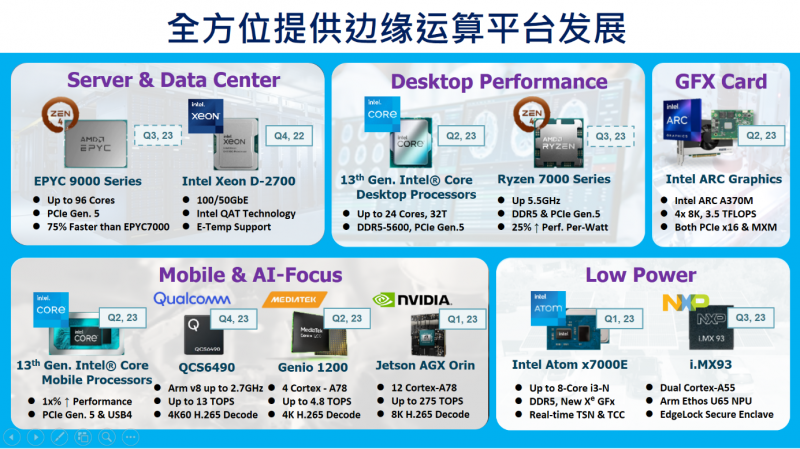 張家豪認(rèn)為目前邊緣運(yùn)算有兩大發(fā)展方向:第一是往高效能發(fā)展,強(qiáng)調(diào)High performance computing(HPEC);第二是往Edge AI發(fā)展,研華在Embedded Design-in的核心競爭力除了積累多年的實(shí)戰(zhàn)經(jīng)驗(yàn)之外,還可為客戶提供一系列的R&D服務(wù)、技術(shù)設(shè)計(jì)服務(wù),包括軟件和硬件。相比傳統(tǒng)的嵌入式計(jì)算,研華看到了從低功耗、標(biāo)準(zhǔn)通用型平臺到邊緣運(yùn)算的轉(zhuǎn)變。因此,研華非常重視產(chǎn)品的高效能發(fā)展,特別是在HPEC架構(gòu)下。此外,研華也看到了AI技術(shù)對于邊緣運(yùn)算產(chǎn)業(yè)和嵌入式電腦產(chǎn)業(yè)的趨勢,因此他們正在努力將AI技術(shù)導(dǎo)入,形成Edge AI平臺。