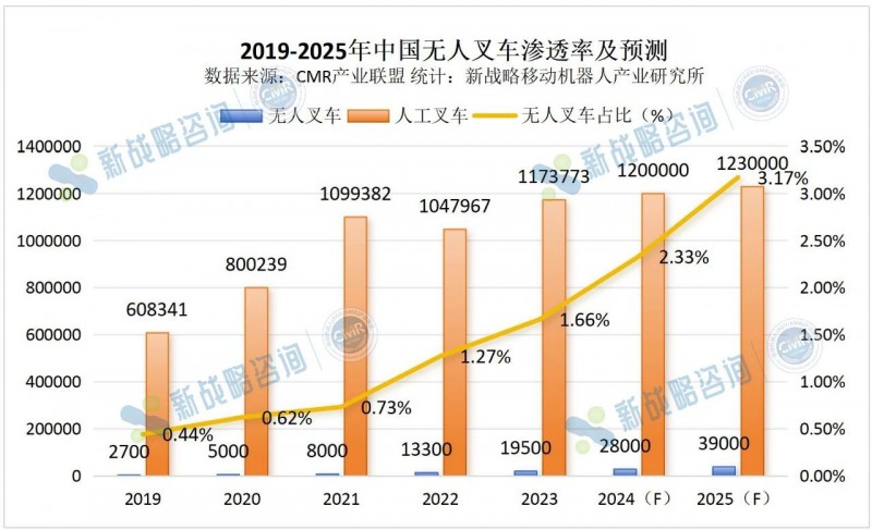 圖表:2019-2025年中國無人叉車滲透率及預測