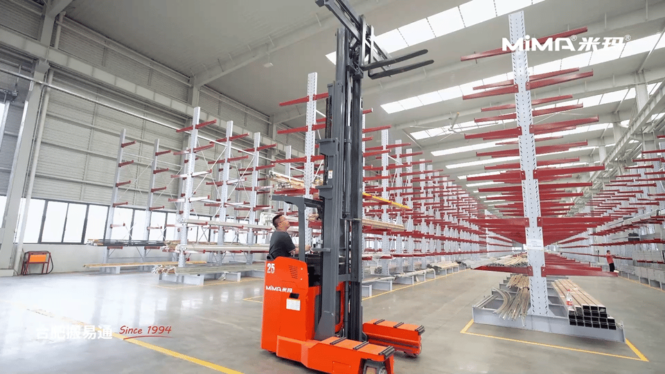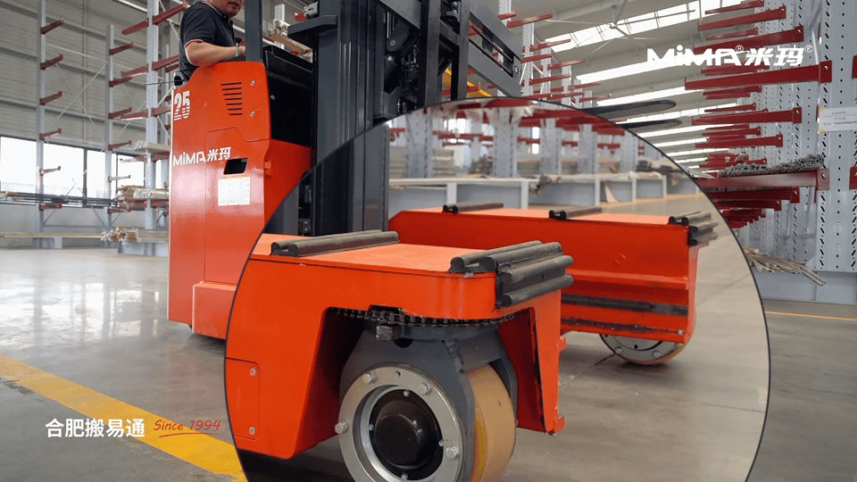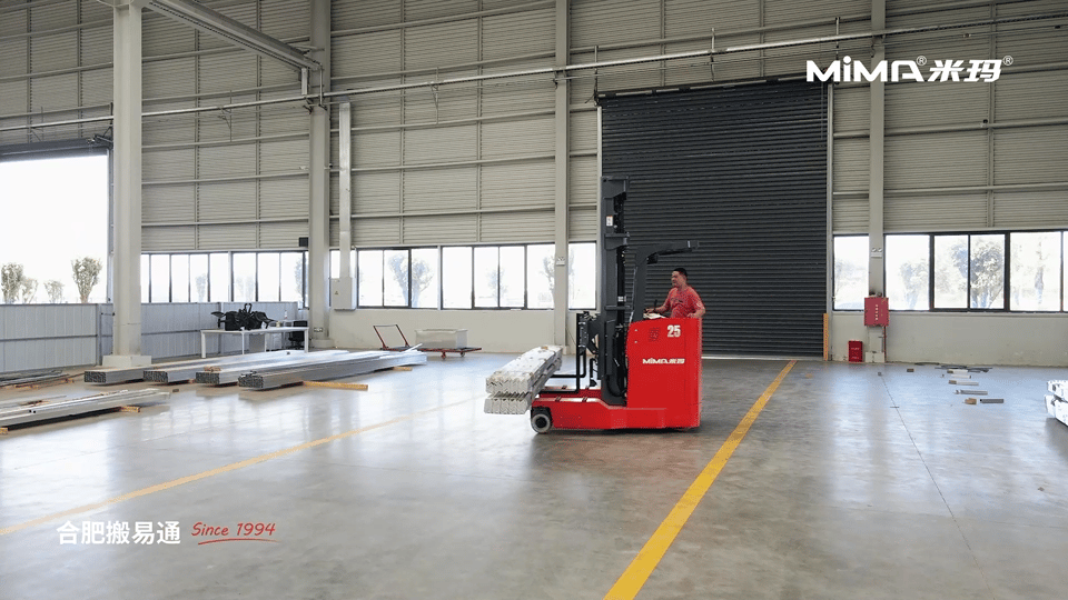 2、為了滿足長重物料的靈活搬運(yùn)需求,建議客戶采購并使用MiMA米瑪窄體全向叉車MQ25,這款叉車額定載荷2.5噸,擁有多種行駛模式,側(cè)行通道更小,能夠完美適配窄巷道作業(yè)環(huán)境。
