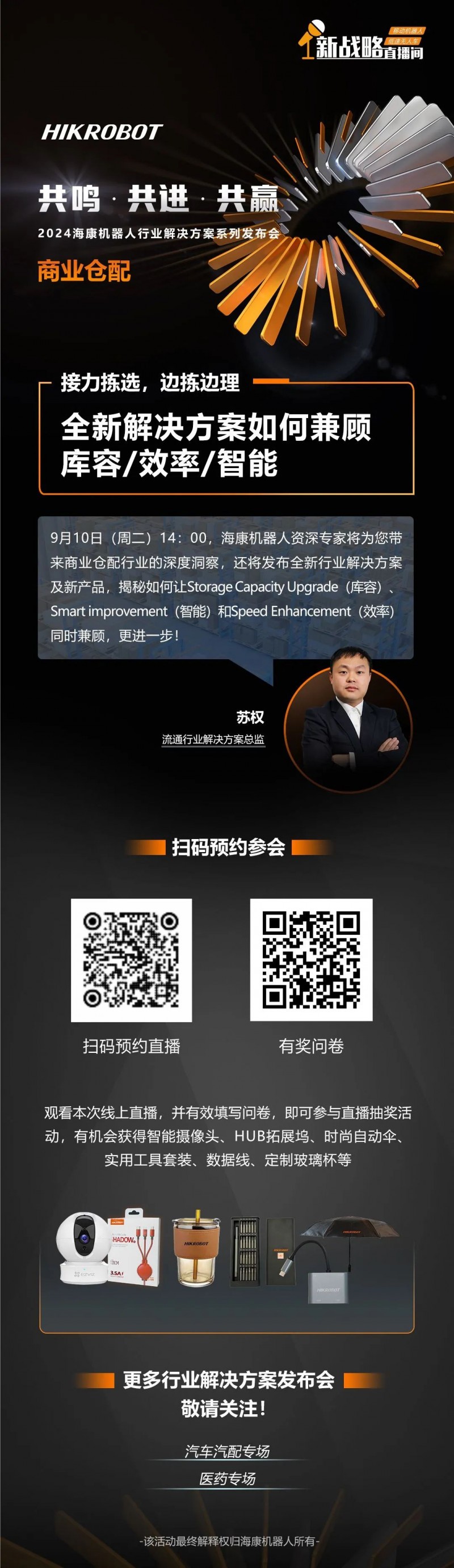 9月10日(周二)14:00,??禉C器人資深專家將帶來商業倉配行業的深度洞察與技術分享,同時發布全新行業解決方案和新產品,揭秘新方案如何做到任務解耦,接力揀選,同時突破揀、理貨無法并行的挑戰,做到邊揀邊理,讓