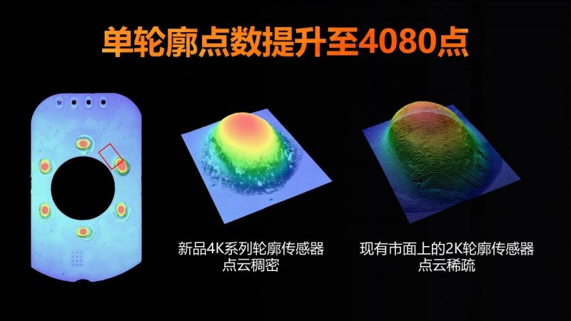 新一代3D激光輪廓傳感器的單輪廓點(diǎn)數(shù)提升至4080點(diǎn),相比2K分辨率產(chǎn)品,在相同測(cè)量范圍下的X軸分辨率提升接近2倍,使輪廓傳感器能夠更好地捕捉復(fù)雜表面特征,如凹陷、突起和反光表面。通過(guò)FPGA硬件加速,最高掃描幀率提升至49KHz,使相機(jī)能更好地滿(mǎn)足現(xiàn)代高速生產(chǎn)線的需求,確保在高速度下仍能保持高精度的測(cè)量,為高精度、高速率測(cè)量的檢測(cè)場(chǎng)景提供更高效的解決方案。