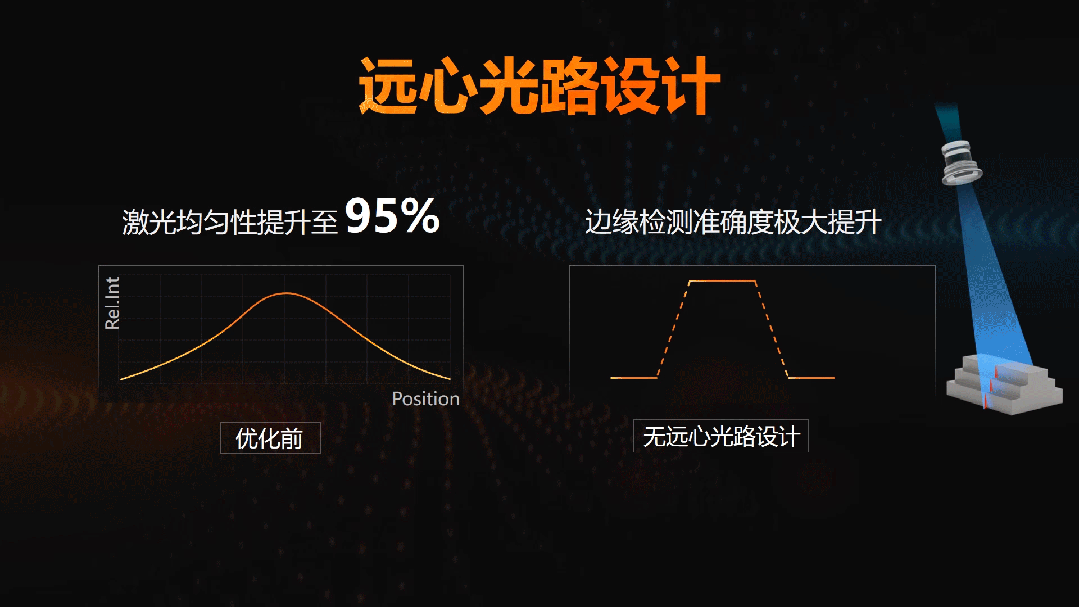 新一代3D激光輪廓傳感器的激光模塊采用近遠(yuǎn)心光路,并配備定制化大光圈鏡頭,使激光均勻性提升至95%,有效減少視野盲區(qū),極大提升邊緣檢測(cè)準(zhǔn)確度。