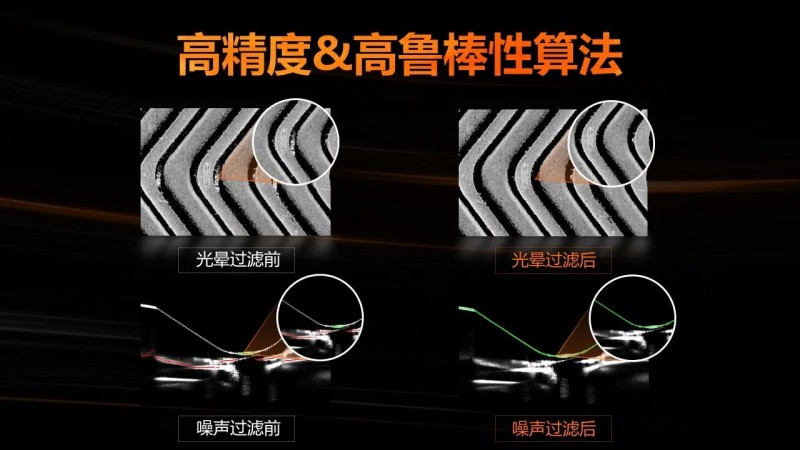 新一代3D激光輪廓傳感器內(nèi)置全面升級(jí)的視覺(jué)算法,超高亞像素算法精度可達(dá)1/16像素。多幀圖像融合技術(shù)使輪廓數(shù)據(jù)提取更加完整,光暈過(guò)濾和連續(xù)性濾除可以有效降低反光干擾的影響,提升算法在不同應(yīng)用場(chǎng)景下的魯棒性。