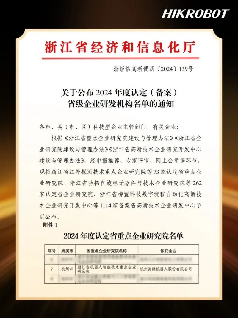 近日,浙江省經濟和信息化廳發布《關于2024年度認定(備案)省級企業研發機構名單的通知》,其中??禉C器人“浙江省機器人智能技術重點企業研究院”成功通過浙江省經濟和信息化廳的審核、評審及公示等環節,被認定為“浙江省重點企業研究院”。