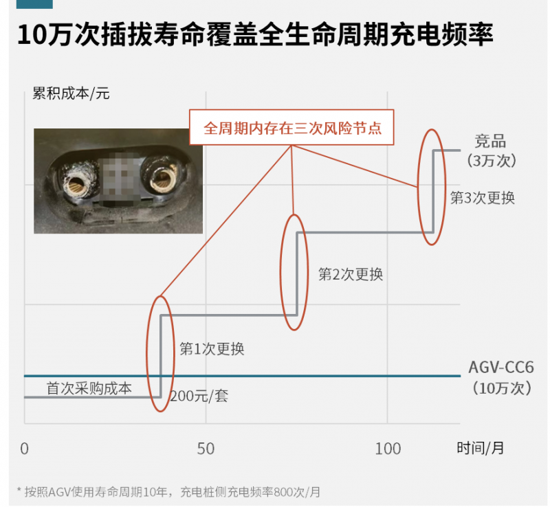 在移動(dòng)機(jī)器人的全生命周期內(nèi),與3萬(wàn)次插拔壽命的連接器相比,史陶比爾AGV-CC6連接器憑借高達(dá)10萬(wàn)次的插拔壽命,展現(xiàn)出了更為顯著的成本效益。具體而言,使用 AGV-CC6,10年內(nèi)僅需承擔(dān)首次采購(gòu)成本;競(jìng)品更換第一套備件后,累積成本就已遠(yuǎn)超AGV-CC6,還不包括其產(chǎn)生的大量人工成本和生產(chǎn)停機(jī)成本。此外,史陶比爾也在持續(xù)推進(jìn)本地化降本,使得AGV-CC6性?xún)r(jià)比更具優(yōu)勢(shì)。
