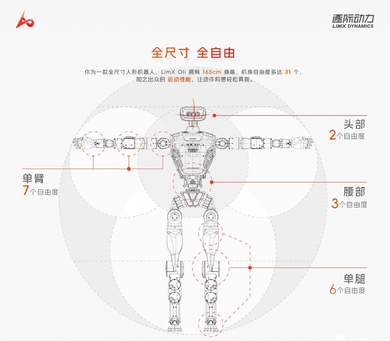 LimX Oli在這一點上沒有選擇“妥協式”的小尺寸方案,而是直接采用了165cm 的標準身高與31個機身主動自由度,構建出貼近人類軀體結構的通用人形構型。其自由度分布涵蓋: