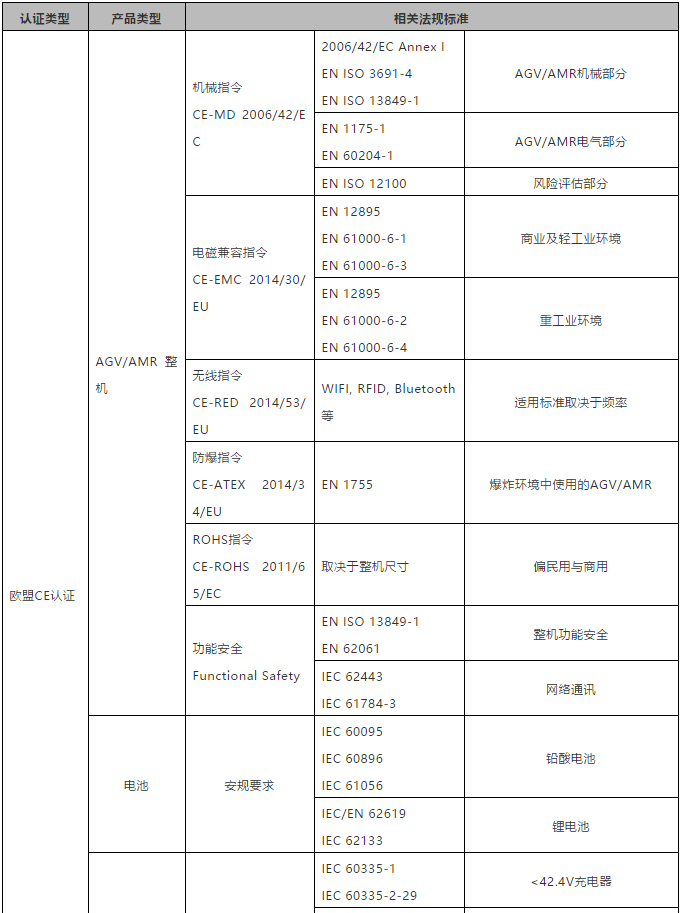 AGV/AMR整機(jī)隸屬于機(jī)械產(chǎn)品,全球各個(gè)國家和地區(qū)對于機(jī)械產(chǎn)品的進(jìn)口都有相關(guān)法規(guī)要求,用以保護(hù)人員的健康,財(cái)產(chǎn)和環(huán)境要求。同時(shí),由于各國技術(shù)發(fā)展與社會發(fā)展水平不同,對于機(jī)械產(chǎn)品安全認(rèn)證要求,從法規(guī)標(biāo)準(zhǔn)體系,產(chǎn)品認(rèn)證范圍,到市場監(jiān)管體系均不一致,因此機(jī)械產(chǎn)品出口到不同的國家與地區(qū),涉及的認(rèn)證要求不一樣。相應(yīng)的AGV/AMR所用到的關(guān)鍵零部件,對應(yīng)不同市場也有相應(yīng)的法規(guī)標(biāo)準(zhǔn)要求。