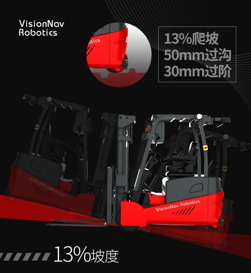 VNP20裝載了450mm的高耐磨實心橡膠輪,實現13%最大坡度、50mm最大過溝寬度以及30mm最大過階高度的越障能力,輕松應對外月臺、室外等高速、高負載作業工況。