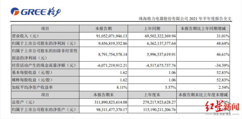 根據(jù)格力電器發(fā)布其2021年上半年財(cái)報(bào)顯示,2021年上半年,格力實(shí)現(xiàn)營收911億元,同比增長31%。主營收入為709.32億元,同比增長42.69%。利潤總額 109.76億元,42.62%;實(shí)現(xiàn)歸屬于上市公司股東的凈利潤94.57億元,同比增長48.64%。基本每股收益1.62元,同比增長52.83%。其中,2021上半年格力智能裝備收入為1.98億元,同比減少5.44%,占比總營收 0.22%。