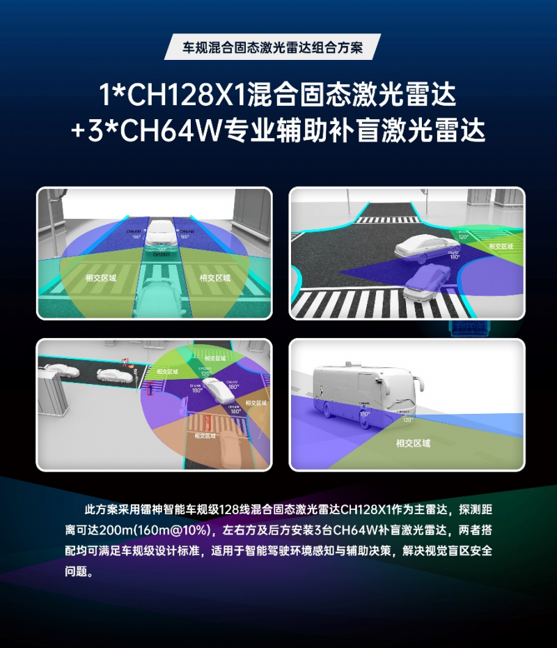 鐳神智能自主創新和尋求突破的步伐從未停止,于2021年先后推出車規級的CH128X1 128線混合固態激光雷達和補盲神器CH64W超大視場角混合固態激光雷達,迷你身板,蘊藏更強大的遠程探測和感知性能。