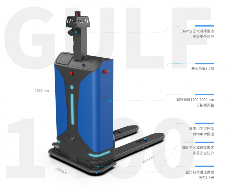 Gulf-1400-CDD無人叉車采用斯坦德自研激光SLAM導航技術,無需固定基礎設施改造即可完成部署運行,同時通過托盤到位檢測傳感器、貨叉防撞傳感器、3D視覺相機、RFID等多傳感器融合技術,實現智能高效安全取放料作業。