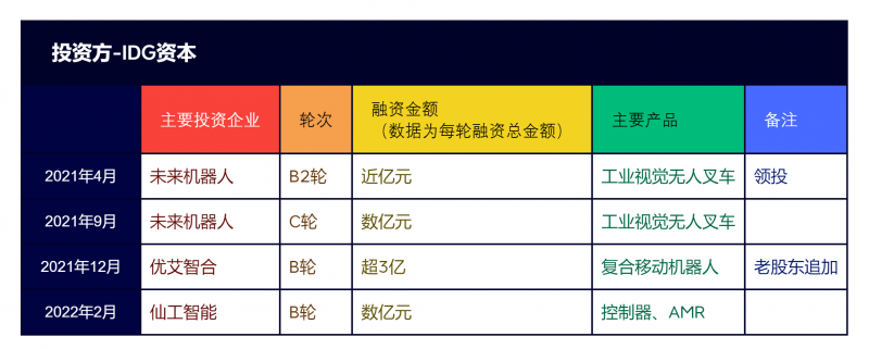 2021年4月至2022年2月期間,IDG資本在移動機器人領域投資了未來機器人、優艾智合和仙工智能三家移動機器人企業。