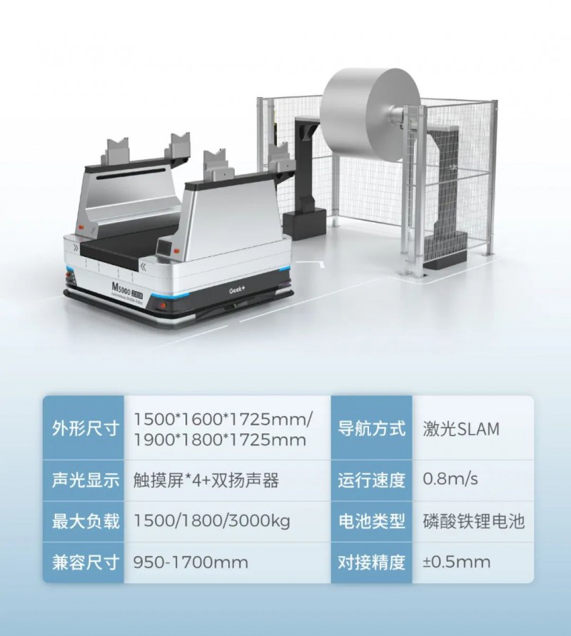 全球AMR引領者極智嘉(Geek+)通過聚焦客戶需求和深耕行業場景,打造出鋰電智造全流程AMR解決方案,現已成功賦能多家鋰電龍頭企業。針對前工序大重量、卷狀物料的搬運困難,極智嘉率先提出雙排叉臂的結構設計,雙舉升機器人單次即可完成卷料的空滿交換,效率成倍提升!