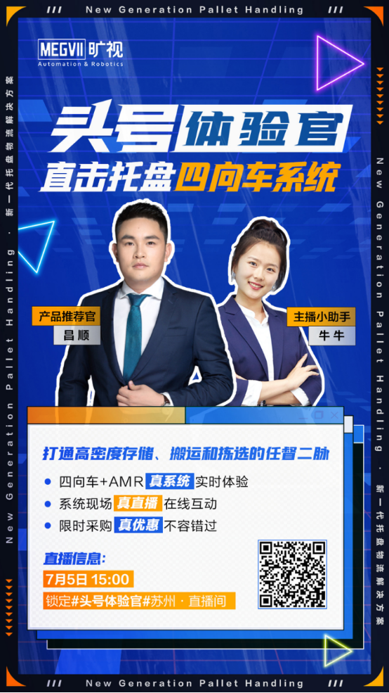 鎖定7月5日15:00,曠視托盤四向車系統“頭號體驗官”直播活動,曠視物流業務事業部產品業務負責人程昌順,將與特邀四向車系統用戶代表一起,為你一一解答。